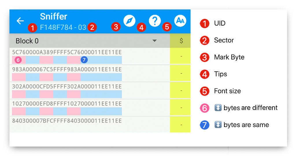 在获取包含有效数据的扇区的密钥后,我们需要比较不同数量的数据。因此我们制作了嗅探功能以便更轻松地收集和比较数据。 浅粉色和浅蓝色背景显示字节是否发生变化。